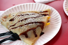 Don't laugh...yes, 2 eateries at once! Did you really think 3 crepes can fill up a family of 5? And when right across the street a 'hot' pizza stand that always has a long line is line-less, you would go too.