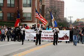 We started at the festival before the marchers arrived, only to find very few activities for children, the location a muddy mess, and parking a drag. We did walk around only to pretend we feasted at the cotton candy, kettle corn and the funnel cake stands. Then we found a place to park off of 11th street for a front row view of the marchers. After 1 hour of waiting, the smaller than expected crowed filled the street. Our next and final stop planned was the MLK statue on University of Texas' campus. After too many one way streets and road closures due to construction, we decided to X-nay our last destination and head home for a way over due lunch.