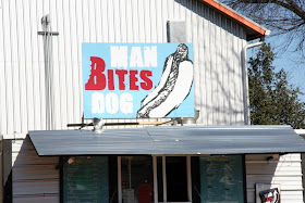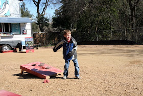 After cold weather and the holidays delayed our trailer trying, this afternoon was the perfect day to start sampling again. Man Bites Dog claims eating a hot dog is an "experience." After today, a Buffalo Hottie (100% Vienna beef frank with bleu cheese crumbles, buffalo wing sauce and green onions) will be a forever craving. It was good! Daddy enjoyed his Bird Dog and the boys like a Plain Jane. As for Ms. Pink...we left her asleep in the car. That is the good thing about trailer eating, you are at a picnic bench right next to the car :)