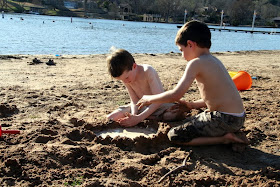 Emma Long Metropolitan Park for some Lake Austin beach fun! Great sand for building, crystal clear water for wading, and acres of land pretty much vacant. The kids were not afraid to try out the water either, still a tad too cool for my liking.