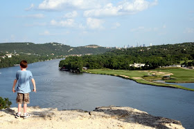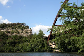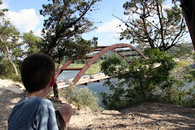 The Pennybacker Bridge (aka the 360 bridge) is a well known Austin landmark. We met up with Daddy today after work to first explore under the bridge. We got our feet wet, watched boats load and unload, and enjoyed the summer-like weather.