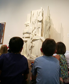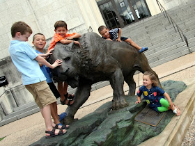 We joined our cousins for story time at the Blanton Museum of Art located downtown on campus. We discovered shapes, lines, and colors within many different works of art. The boys seemed to enjoy it but to a 36 inch toddler, some of the colorful sculptures looked just like a play scape. Their favorite exhibit was Cildo Meireles, composed of 600,000 coins, 800 communion wafers, 2000 cattle bones, 80 paving stones, and black cloth. Maybe because they were able to "touch" this one?
