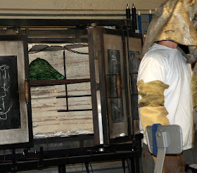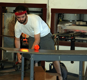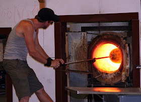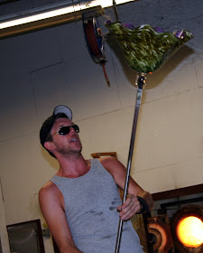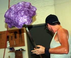 We started off our field trip to Wimberley Glassworks to watch an unbelievable glass making demonstration. Today's demo: green and purple lamp shade. In less than 30 minutes we watched them gather a drop of melted glass heated to a temperature over 2000 degrees, rolled, shaped, broken colored glass added, melted again, reshaped, more air, more color...until it became a gorgeous lamp shade and placed in another oven to cool for the next 24 hours. WOW!