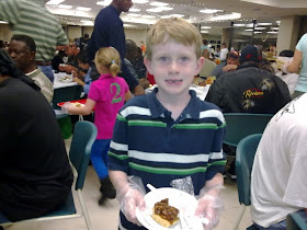 The boys and I headed downtown to provide a sit down Thanksgiving dinner to the homeless last night. We were responsible for the service to 2 tables (16 people). The boys favorite part of the night "carrying the bread basket and dessert tray!"